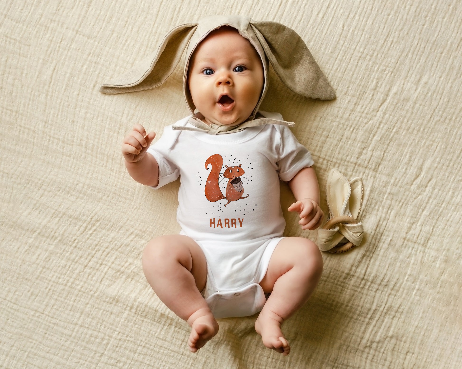 Personalized Baby Bodysuit with Hand-Drawn Squirrel Design